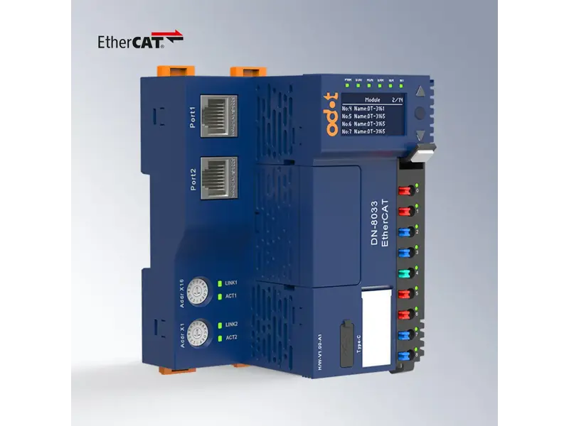 Síťový adaptér DN8033 podporuje standardní protokol EtherCAT, ethernetová komunikace dosahuje rychlosti 100 Mbit/s.