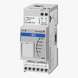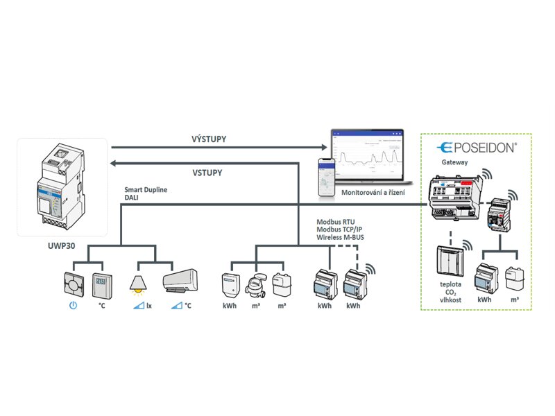 Kompaktní kontrolér UWP30, pro průběžný záznam dat z několika desítek elektroměrů. Po doplnění o prvky vstupů a výstupů umožňuje řídit osvětlení, vytápění a chlazení objektu.